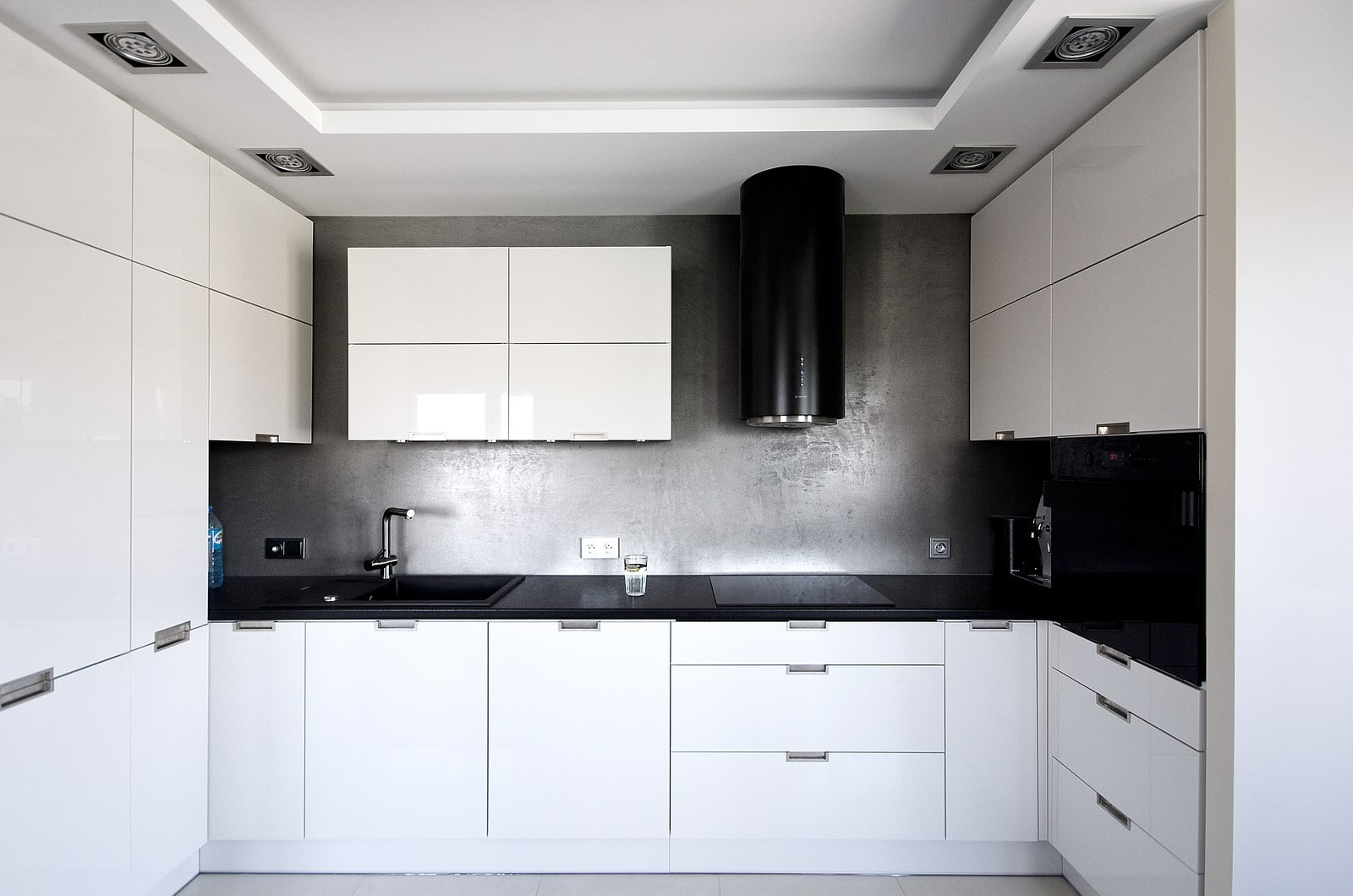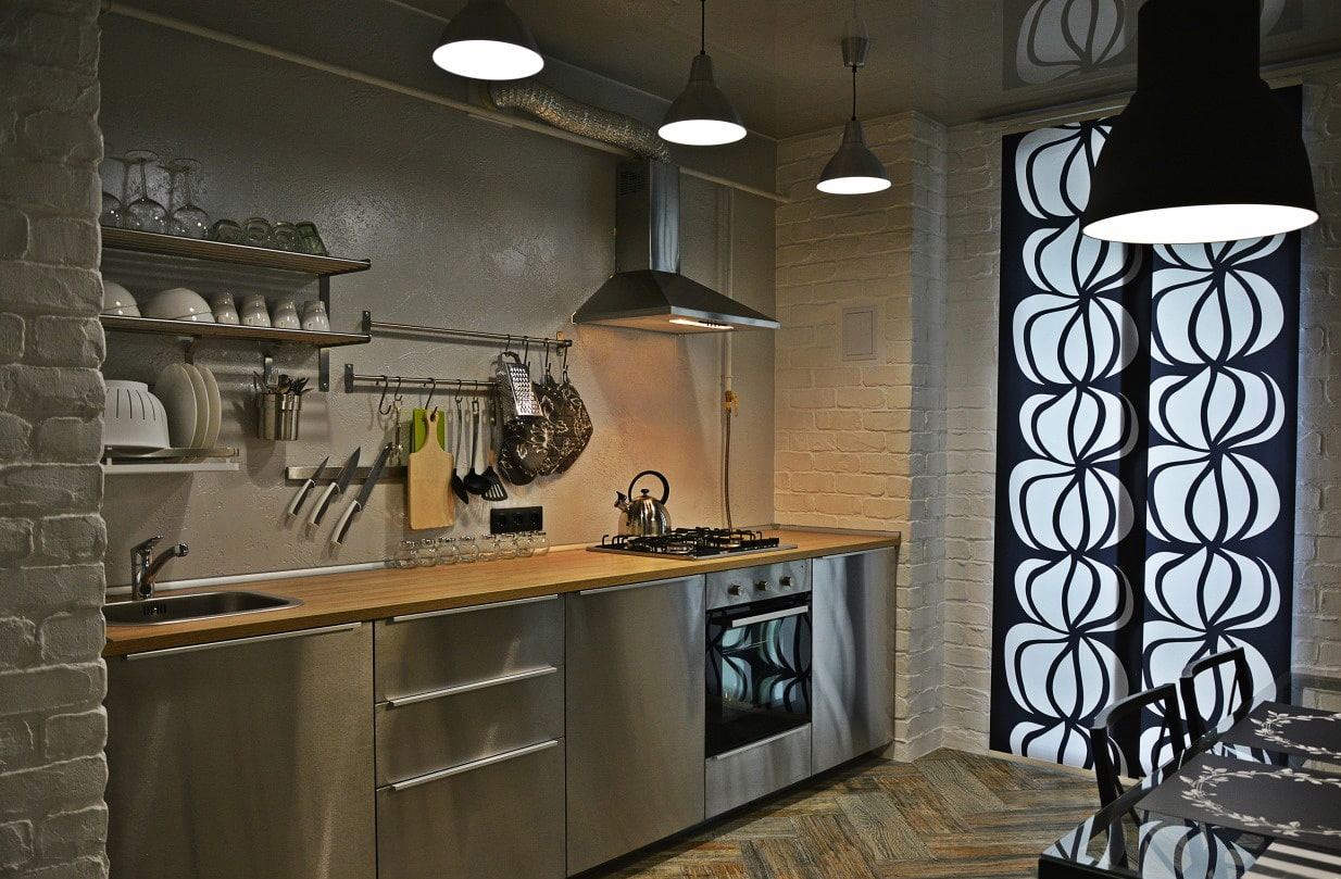 In the photo there is a compact high-tech kitchen with the design of one of the walls under concrete.