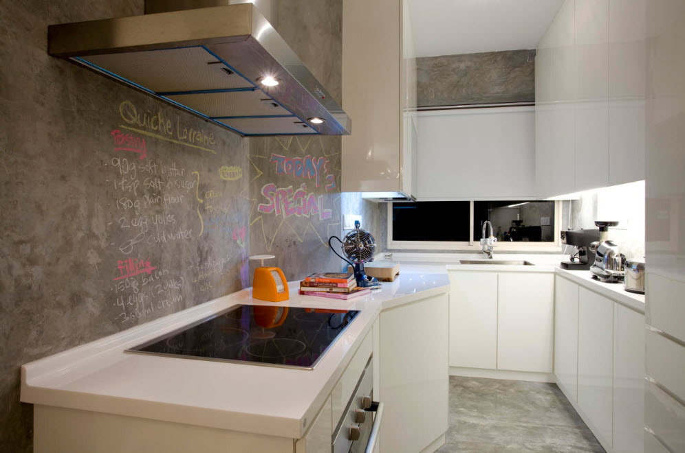 Due to its excellent performance characteristics, the plaster is ideal for finishing a kitchen apron. This design is universal. A bright coating can serve as an accent solution in the interior of both small and spacious kitchens.