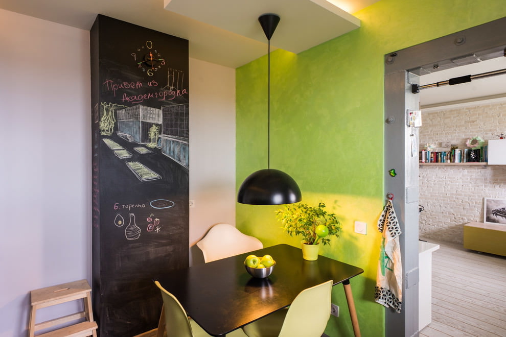 In the photo, the walls and the apron in the kitchen-dining room are decorated with a "silk" effect.