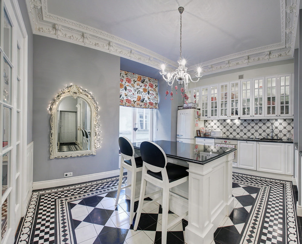 - The kitchen space should serve as a backdrop for furnishings and decorative pieces. Parquet or stone is suitable for finishing the floor, the ceiling of light shades can be decorated with borders or stucco, the walls are preferably plain in neutral light colors. For a bright accent, you can use an "apron" on the work wall, laying it out with beautiful ceramic tiles.
