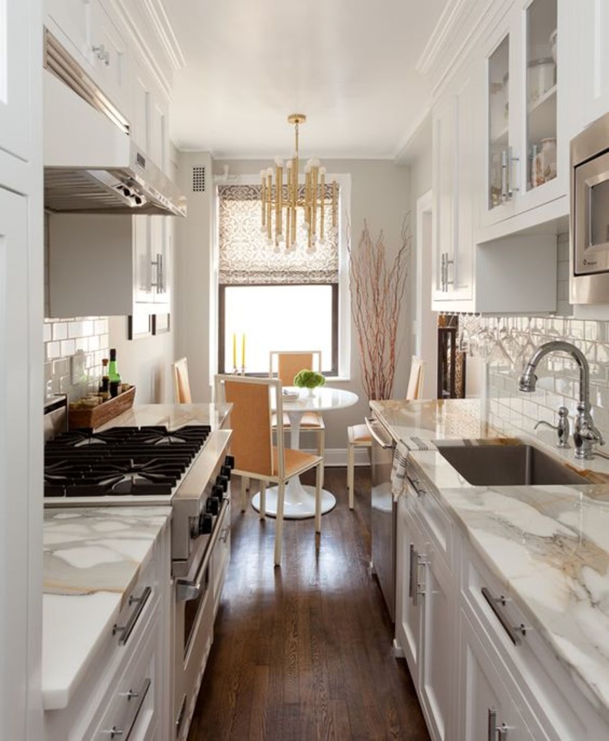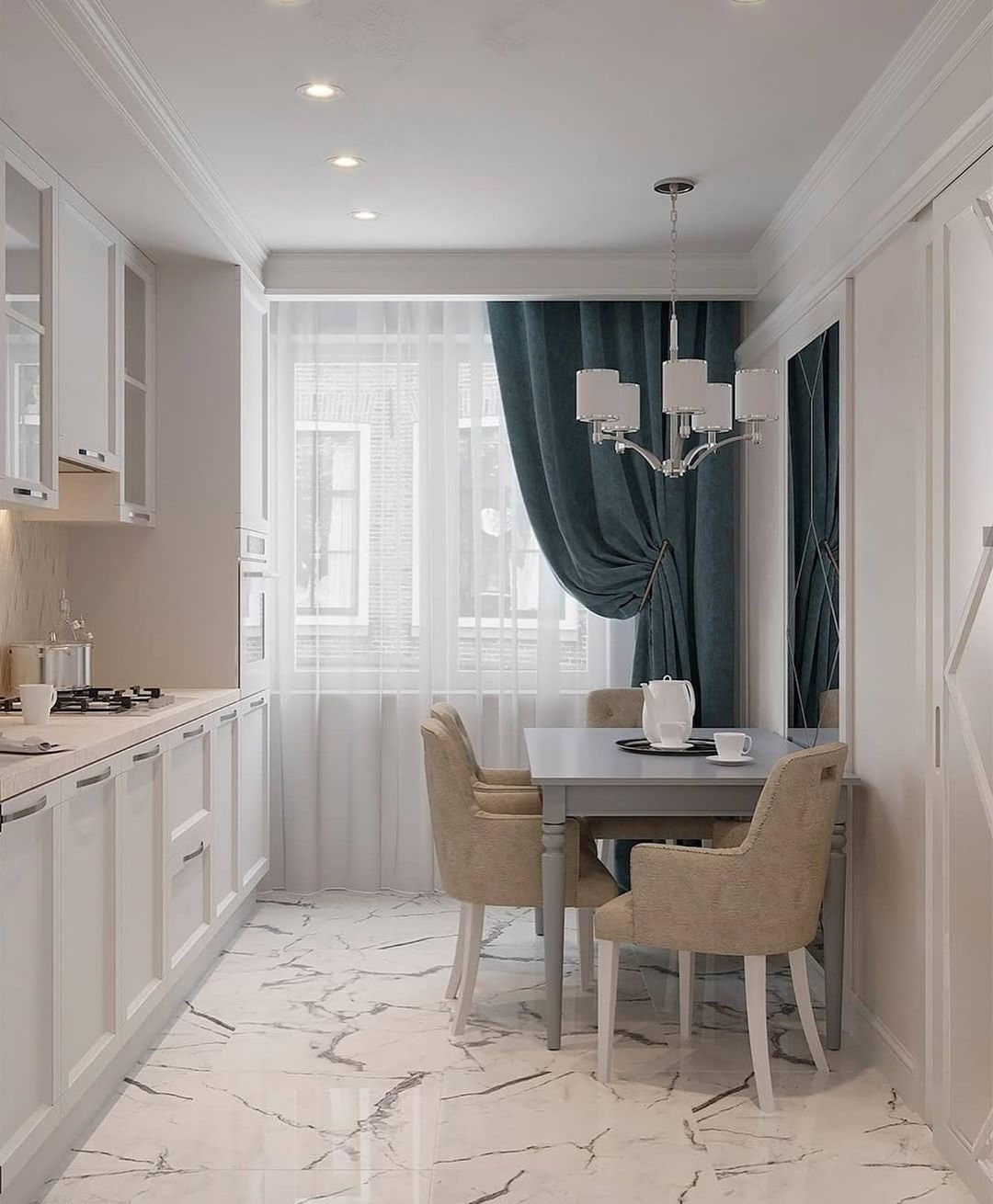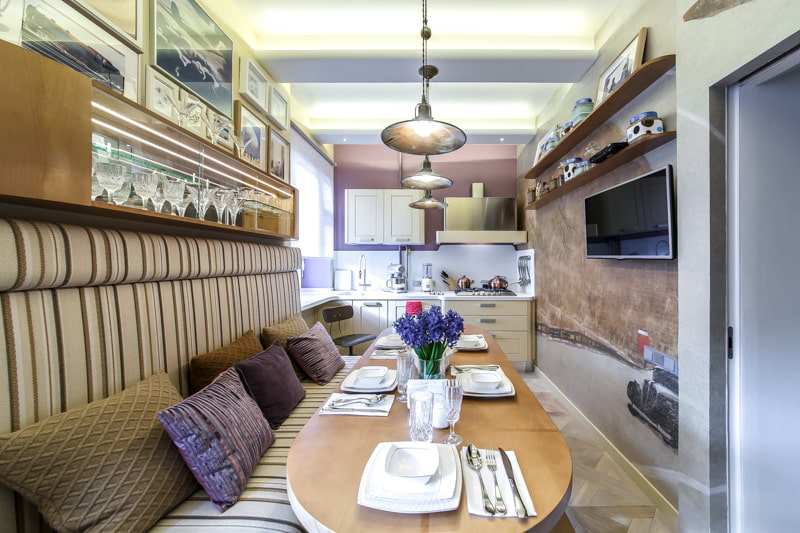 - Linear... The furniture is inexpensive and does not take up much space. Suitable for apartments where they like to eat more than to cook.