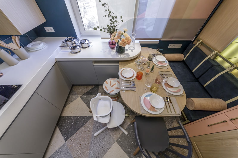 - When drawing up a plan, also consider the presence of a window or balcony. A table with chairs or a work surface of a kitchen set is placed under the window.