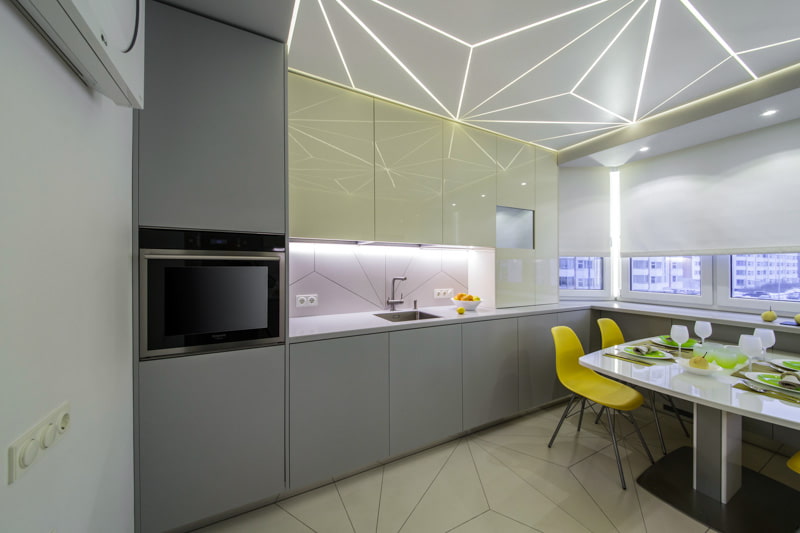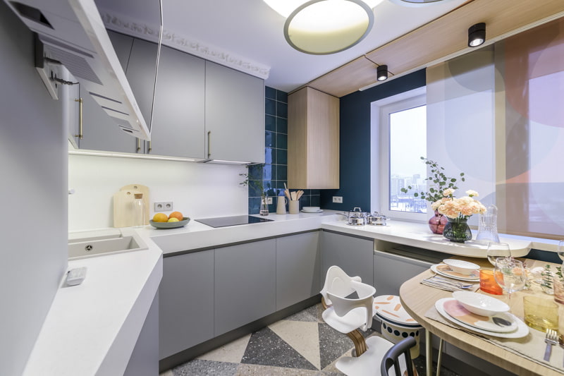 Renovation of the 11-meter kitchen combines aesthetics and practicality. For walls, floors and ceilings, non-staining and easily washable materials are needed.