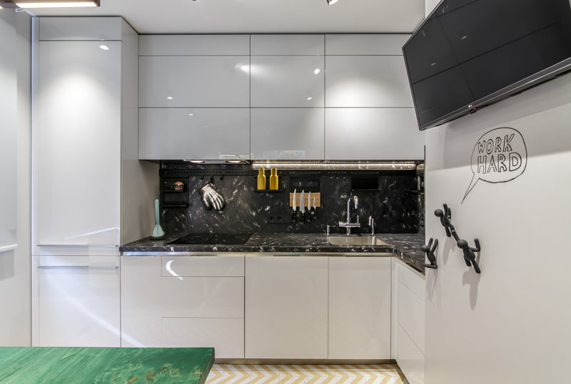 - Walls... Buy materials that are resistant to cleaning, high temperature, humidity. Washable wallpaper or paint simplifies the renovation process and suits any style. Imitation brick masonry fits perfectly into the loft. Tiled walls are suitable where there is a lot of cooking.