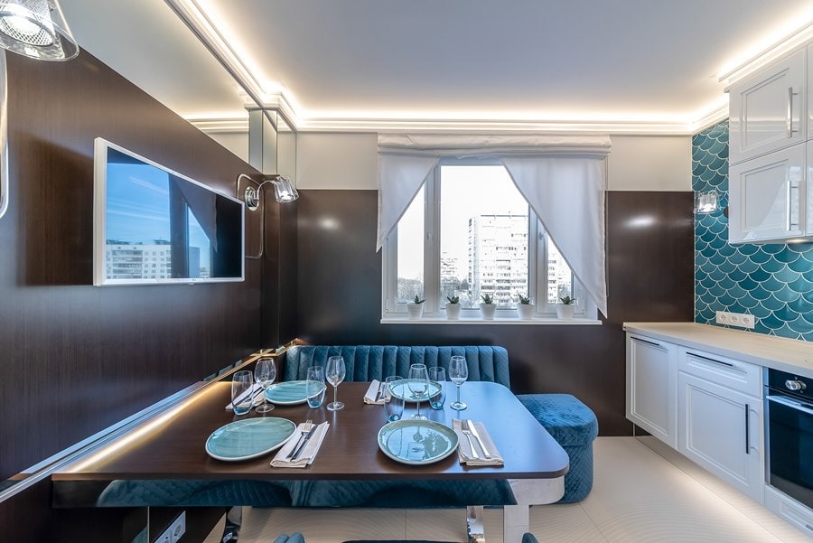 If the set in the 11 sq. Kitchen is made in 2 rows or in the shape of the letter P, choose a built-in sofa. In the linear and L-shaped layout, it is carried over to the opposite side.