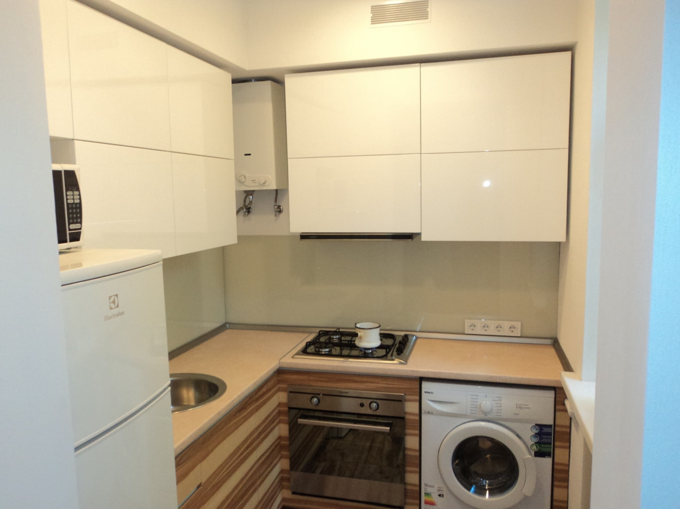 - Straight. Compact, there will be a place for a dining table. Of the minuses - little storage space, very small work area. Suitable for those who do not like to cook, has a small amount of things to accommodate.