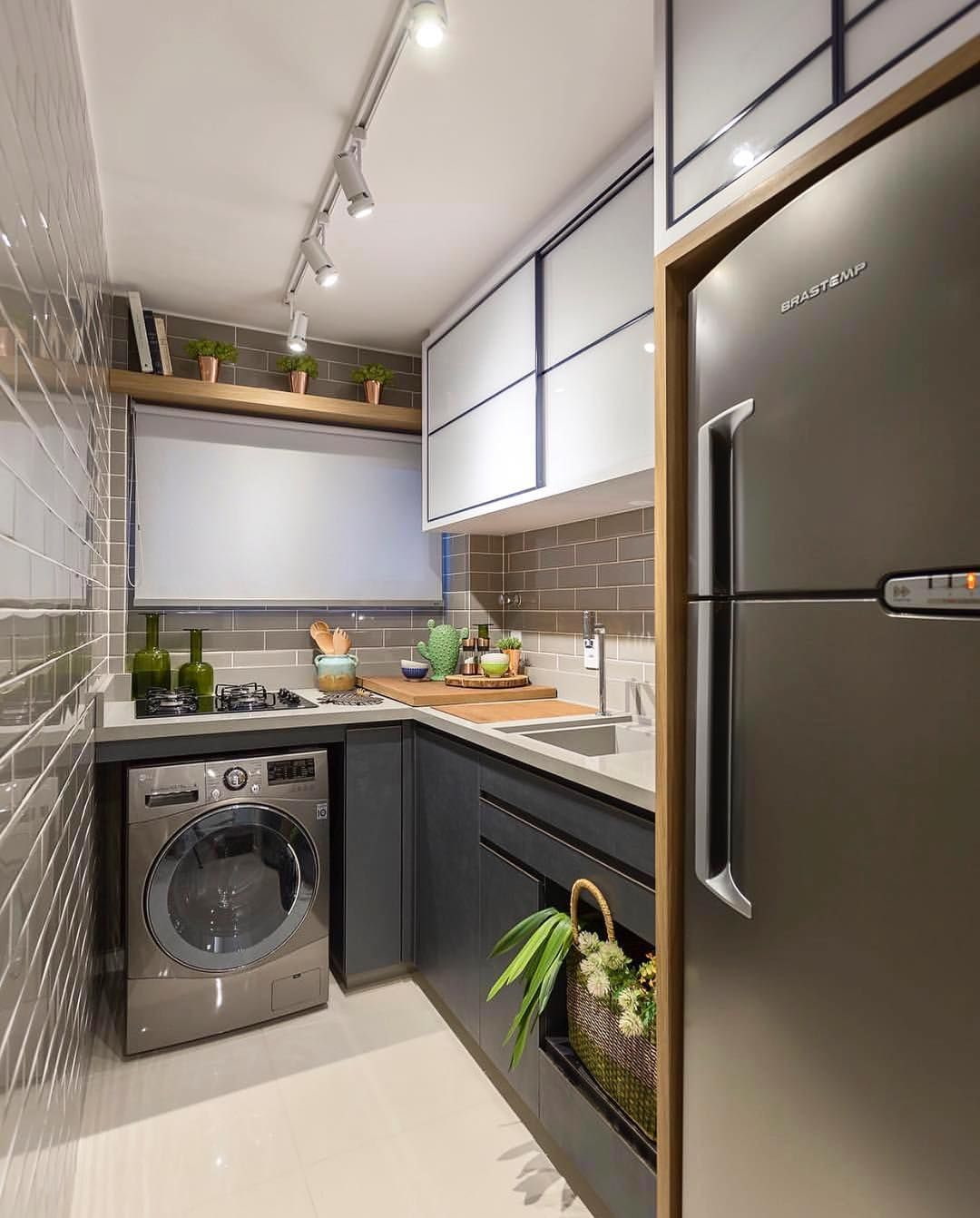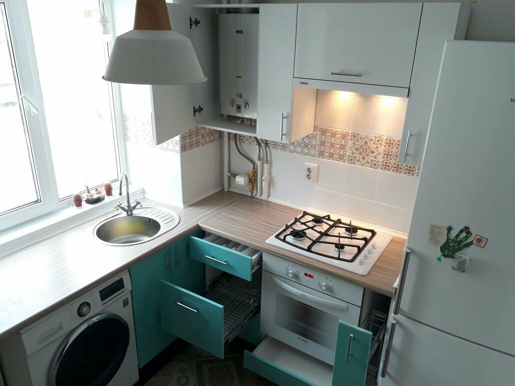 - Washer. If it is possible to remove it from the kitchen - remove it! You should not take up space, which is so small. Or place it under the lower tier, but at the same time you will have to order 2 upper ones for storage.