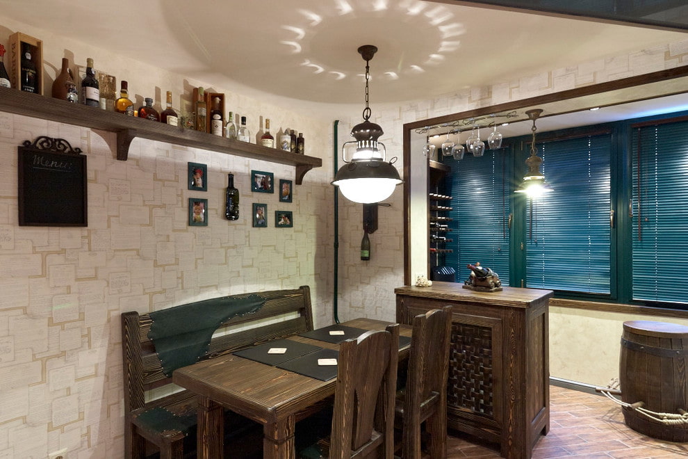 Young families often prefer to place a bar area on the balcony. When the space is partially combined, the window sill is integrated into the countertop, and when fully combined, a bar counter is placed near the windows and cabinets or racks are placed on the sides, in which tea or coffee will be stored.