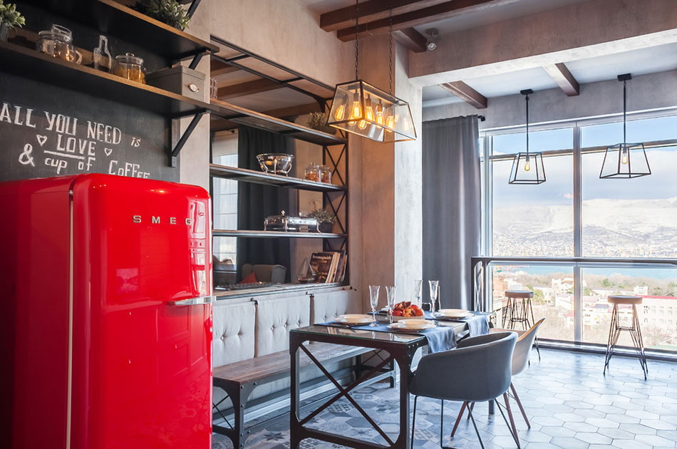 An industrial loft style will ideally fit into a large space. With massive geometric lamps, raw concrete or brick walls and leather upholstery, the environment will look solid and impressive.