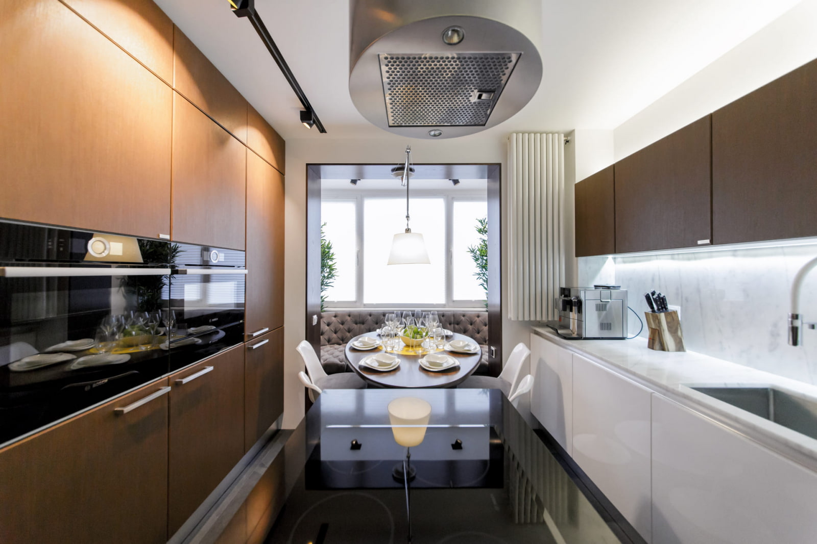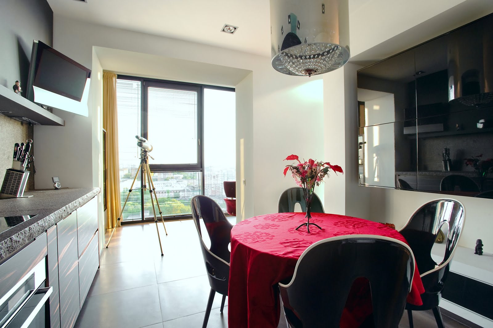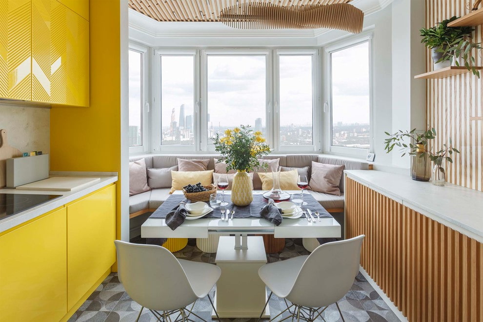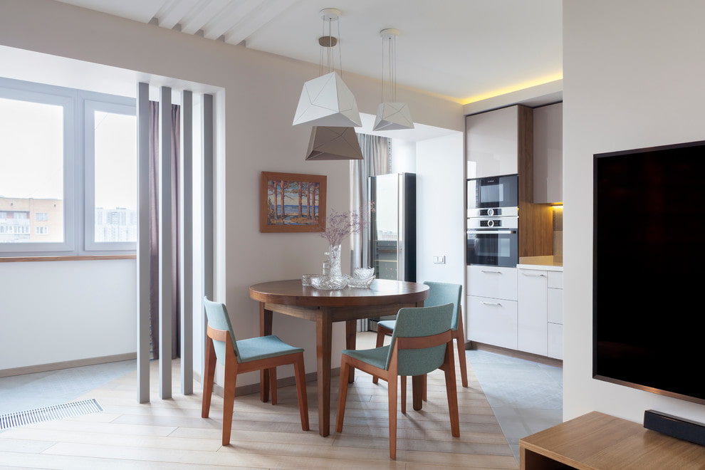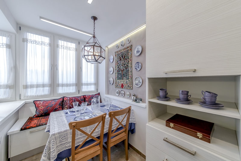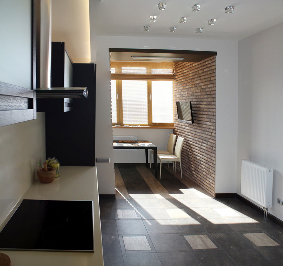 In the photo, the interior of the kitchen passes into the dining area, located on the balcony.