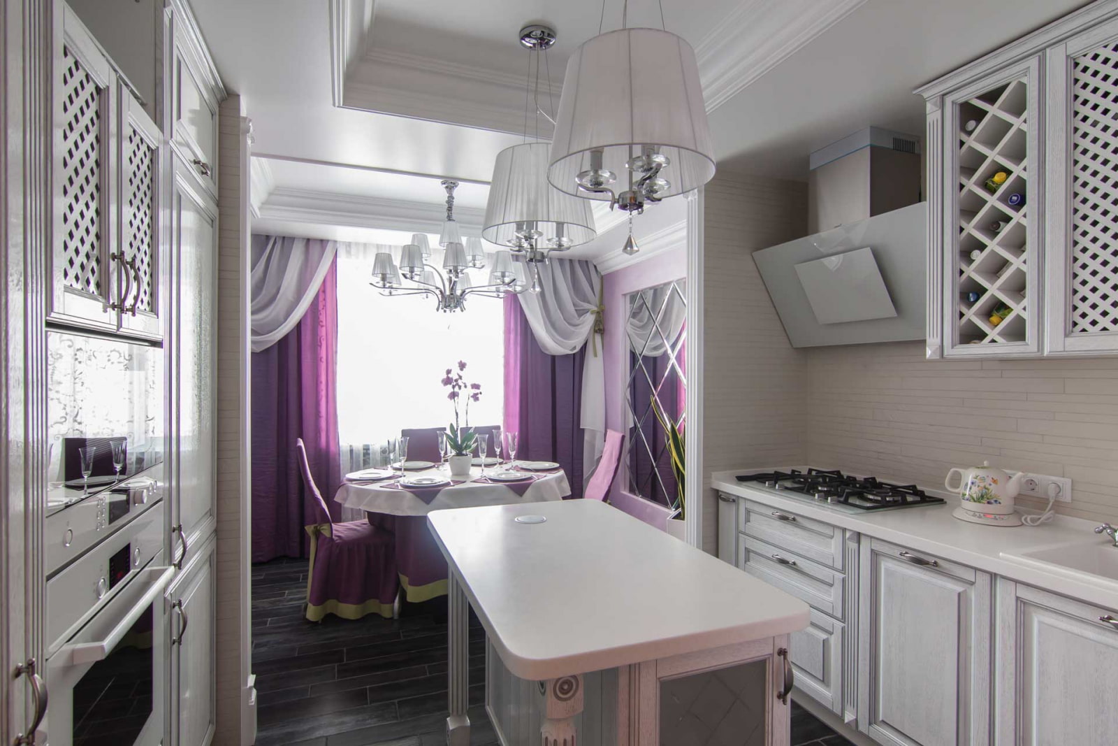 The interior of the combined kitchen can be decorated in a luxurious classic style, a rustic country style or a romantic Provence style, welcoming floral motifs and living potted plants.