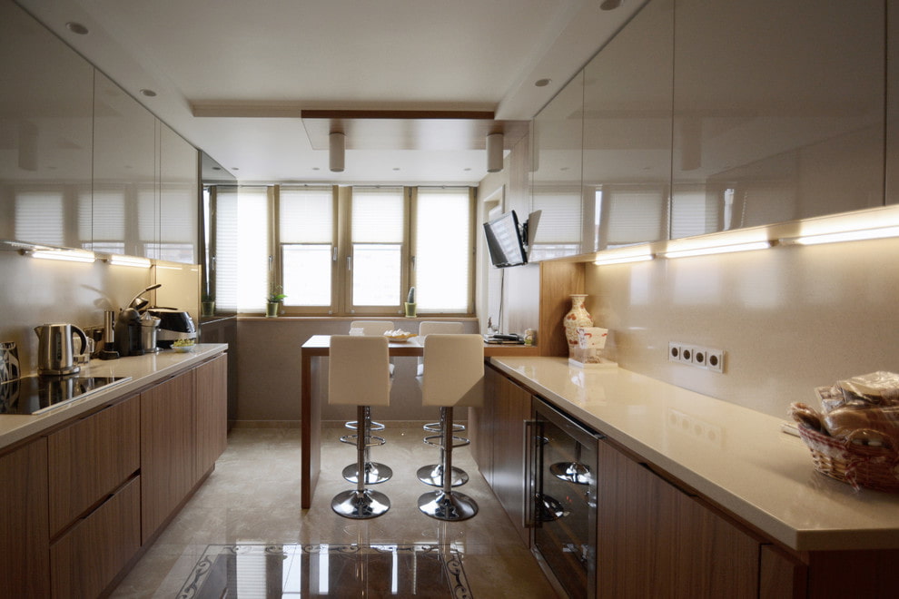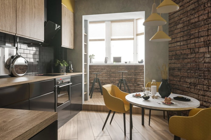 In the photo, the design of the kitchen is combined with a balcony with panoramic glazing.