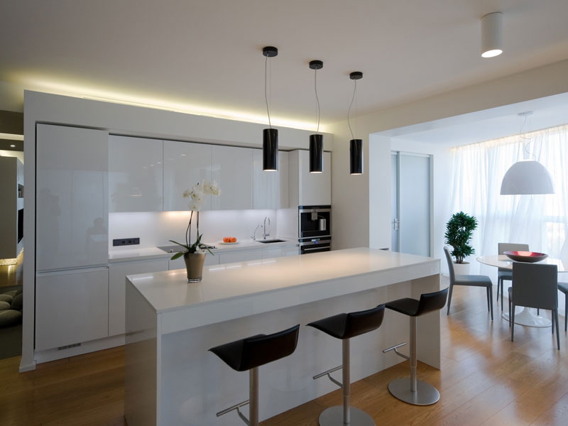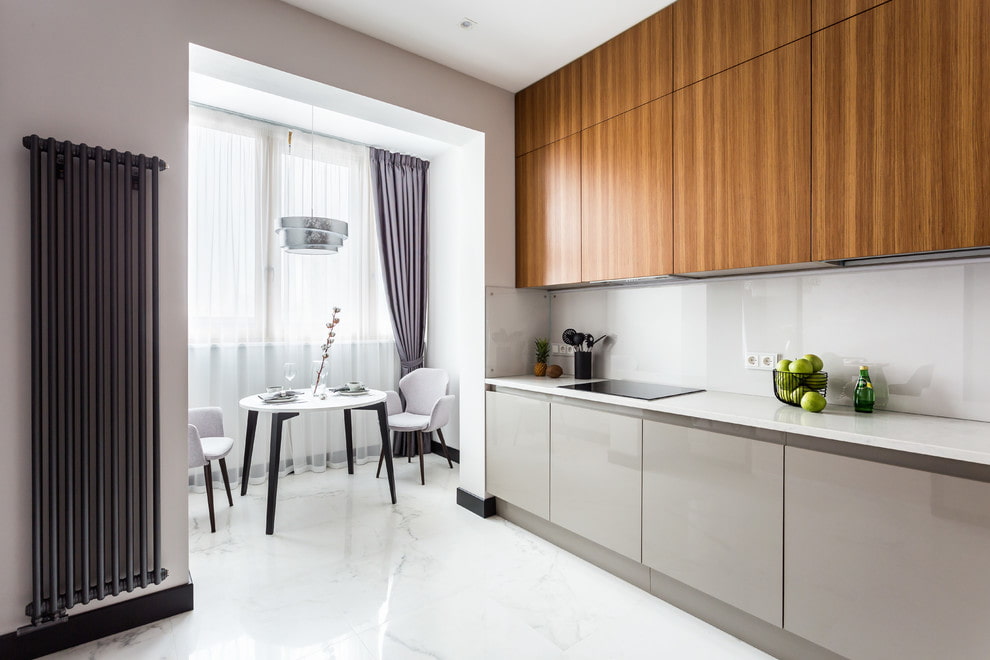 For a small kitchen combined with a loggia, a design in the style of minimalism or hi-tech, assuming a light color scheme and strict lines, is perfect. A small space will visually increase with glass panels, transparent partitions or reflective flooring. A profitable solution would be to create the same monolithic floor for the kitchen and balcony. Thus, the combined room will acquire an integral and harmonious appearance.