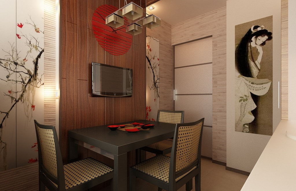 The decor allows the kitchen to have a more expressive theme. For this, accessories are used in the form of wall scrolls, vases, ceramic or porcelain figurines that can be placed in niches. Authentic tableware will become a wonderful decoration. The table can be supplemented with a tea set, a sushi set or a dish with fruits and sweets. Also, the working or dining area will be favorably emphasized by a tatami mat.