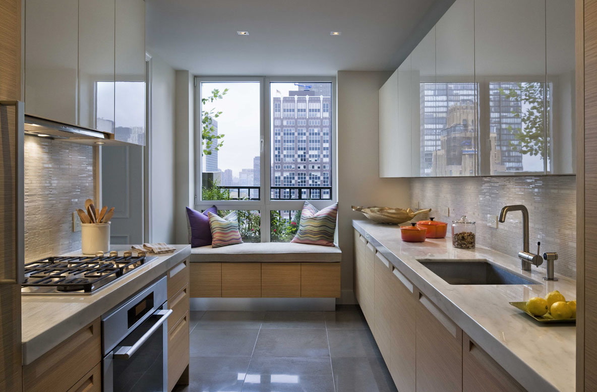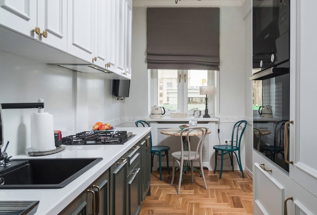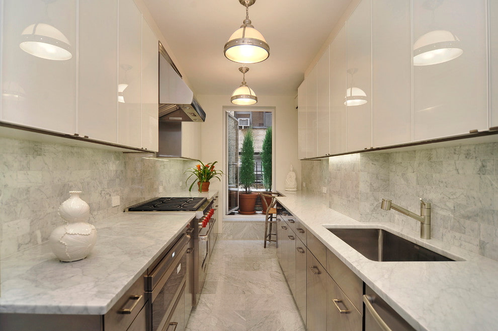 The elongated, but wider kitchen is perfectly complemented by a two-row layout. Visually bringing the far wall closer will be possible with the headset with the letter n. If there is a window, it is possible to dismantle the window sill and install a sink or plate to create a comfortable working area.