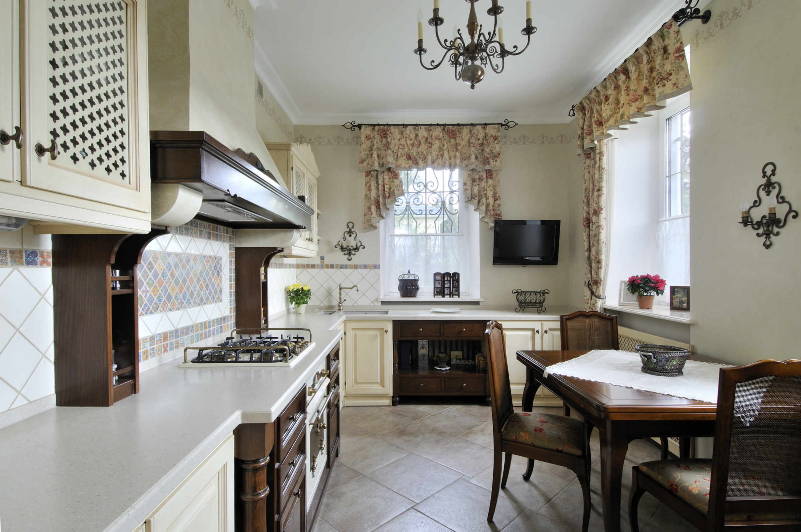 The most serious moment in the design of a kitchen interior is lighting and its competent organization. The most correct would be to use a zonal arrangement. For example, for the working area, the installation of lamps under wall cabinets is suitable, and the dining room space will be complemented by lamps or sconces with a soft and muffled glow, contributing to the creation of a cozy atmosphere.