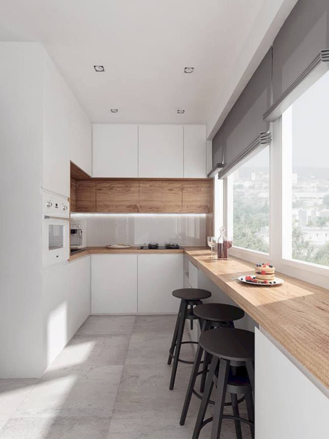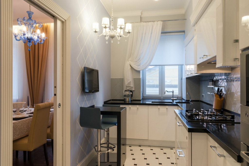 In the design of a narrow kitchen, it is not appropriate to use thick curtains and lush draperies that clutter up the space and poorly transmit natural light. A good solution would be blinds or roller blinds, which are very easy to use and completely invisible when assembled.