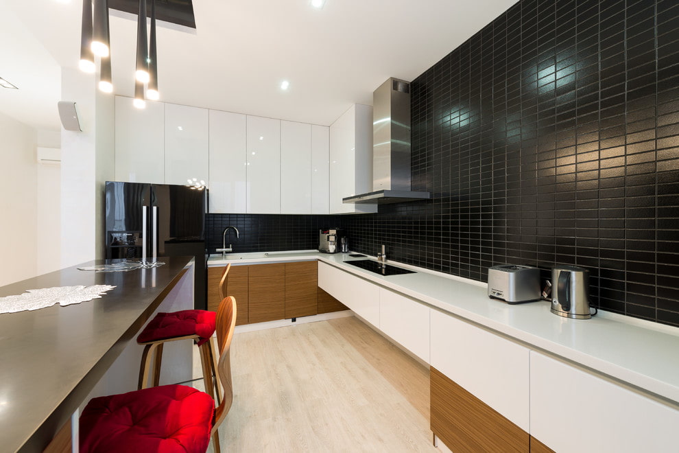 - Apron. In addition to its direct functions, the apron plays the role of the most significant decoration of the kitchen. There are no special restrictions on the design of this element. However, all the same, you should not decorate the apron area with borders and catchy drawings. The finish will look very beneficial, in the form of medium-sized brick or masonry, laconic tiles, mosaics, fashionable patchwork or backlit skins.