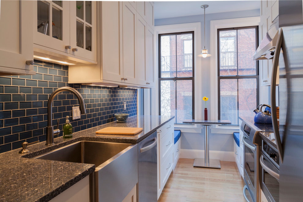 The photo shows the interior of a narrow kitchen with an accent apron tiled with turquoise tiles.