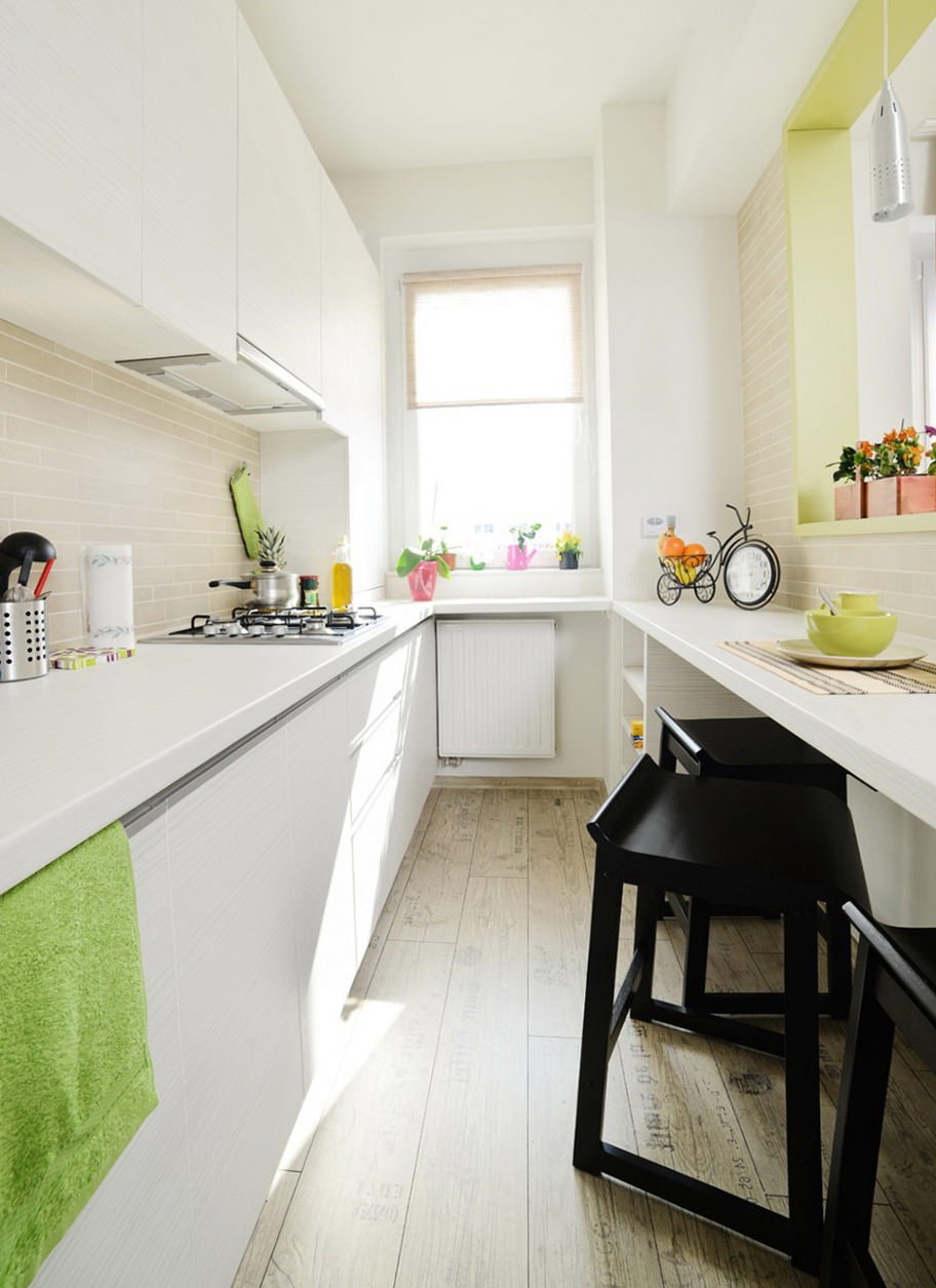 To decorate a narrow kitchen space, a minimum of decorative items is used so that the situation does not look too overwhelmed. The interior can be decorated with a table vase with flowers, paintings or wall panels.