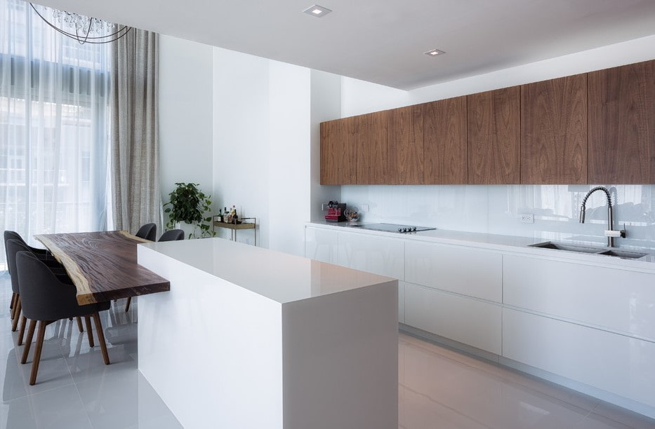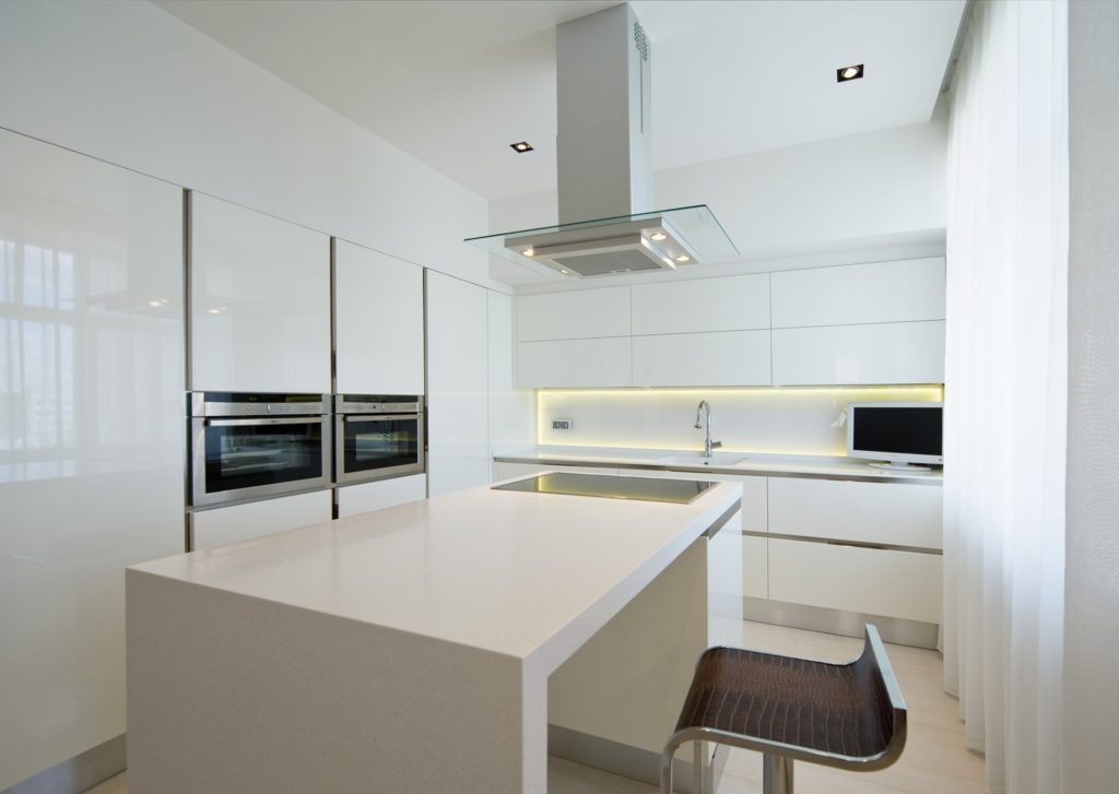 Minimalism in the kitchen is often recreated with white. Contrary to popular belief, snow-white facades do not get dirty more often than others: on the contrary, stains on them are less noticeable, and splashes and food particles are easily rubbed off, since they do not have time to dry.