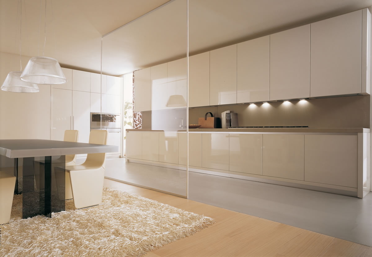 The interior of a white kitchen is considered the standard of cleanliness. The snow-white wall decoration and the plain ceiling seem to merge into a single whole and add space to the room. In the design of the kitchen in the style of minimalism, gray colors are especially popular - from light ash to graphite shades.