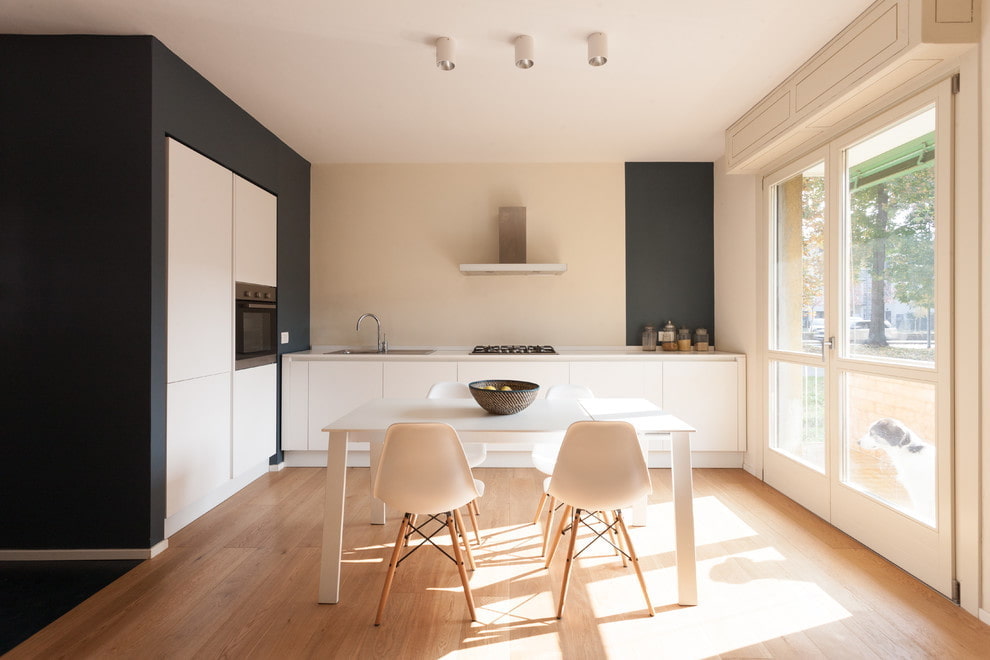 A bright minimalist kitchen should be diluted with contrasting details.The spacious room is decorated with a small number of indoor plants. Also, abstract paintings or black and white photographs with a simple frame will do. You can diversify the interior with the help of an original ceramic floor vase or a container with spices.