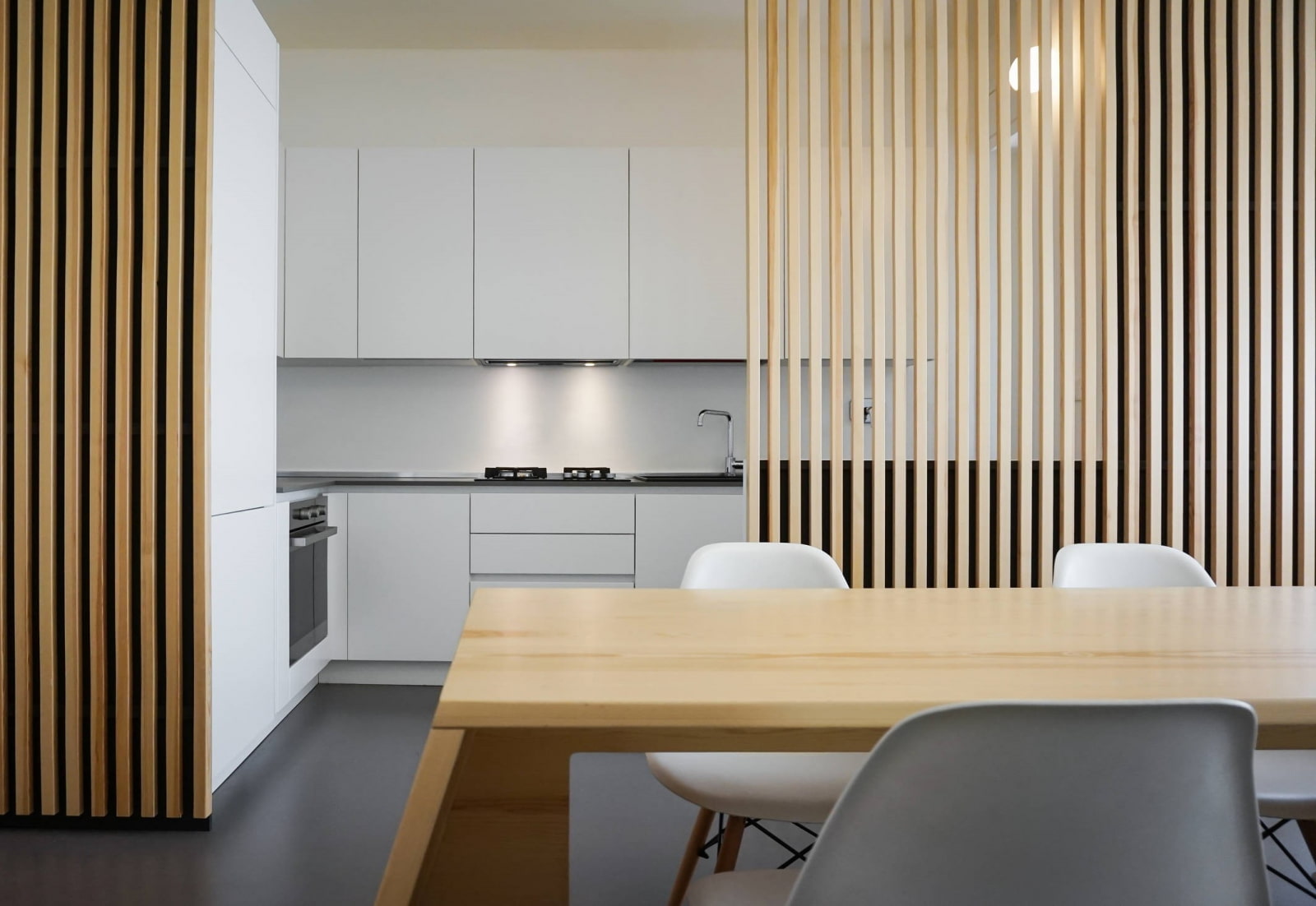 To distinguish between a small kitchen and a living room in a minimalist style, a bar counter with simple chairs is perfect. This zoning option will not only divide the space into clear sections, but also create an original accent detail. To highlight the cooking area, you can use a contrasting apron or spotlights.