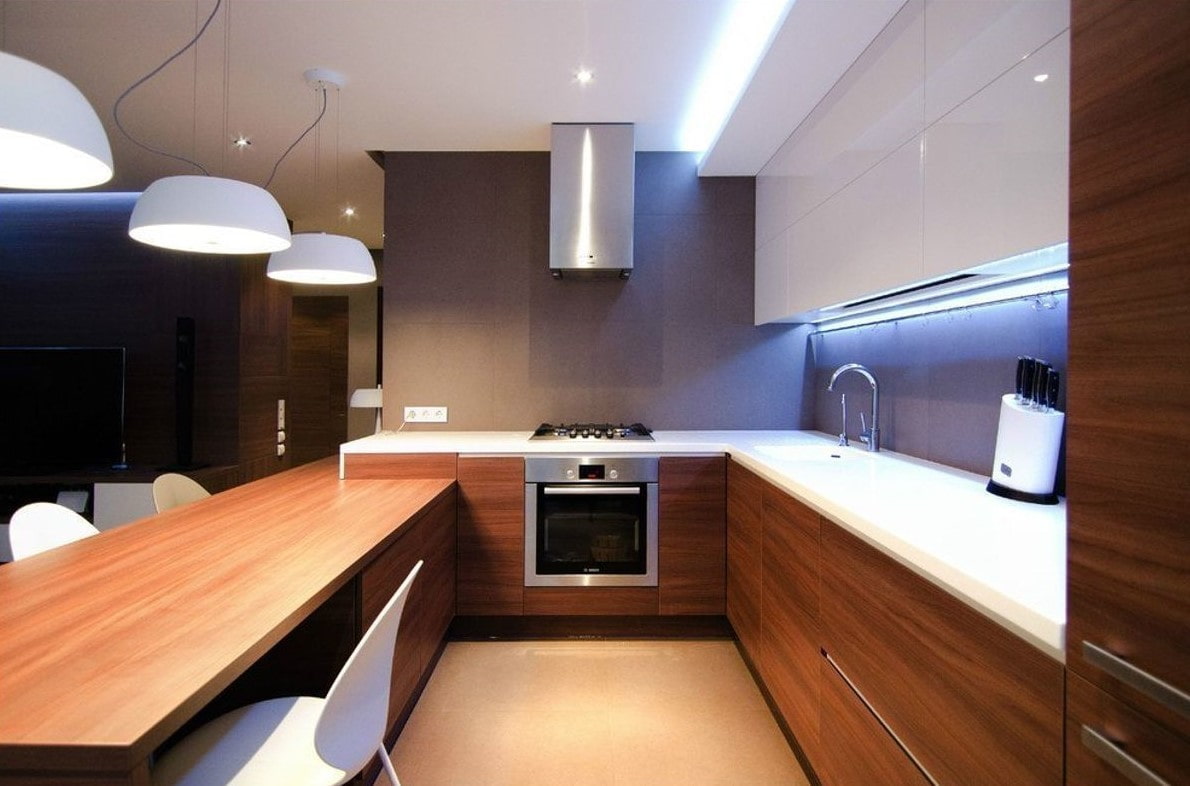 In small apartments, minimalist kitchens do not differ in a large area, therefore, it is necessary to provide at least three sources of artificial light: this will make the room seem more spacious.