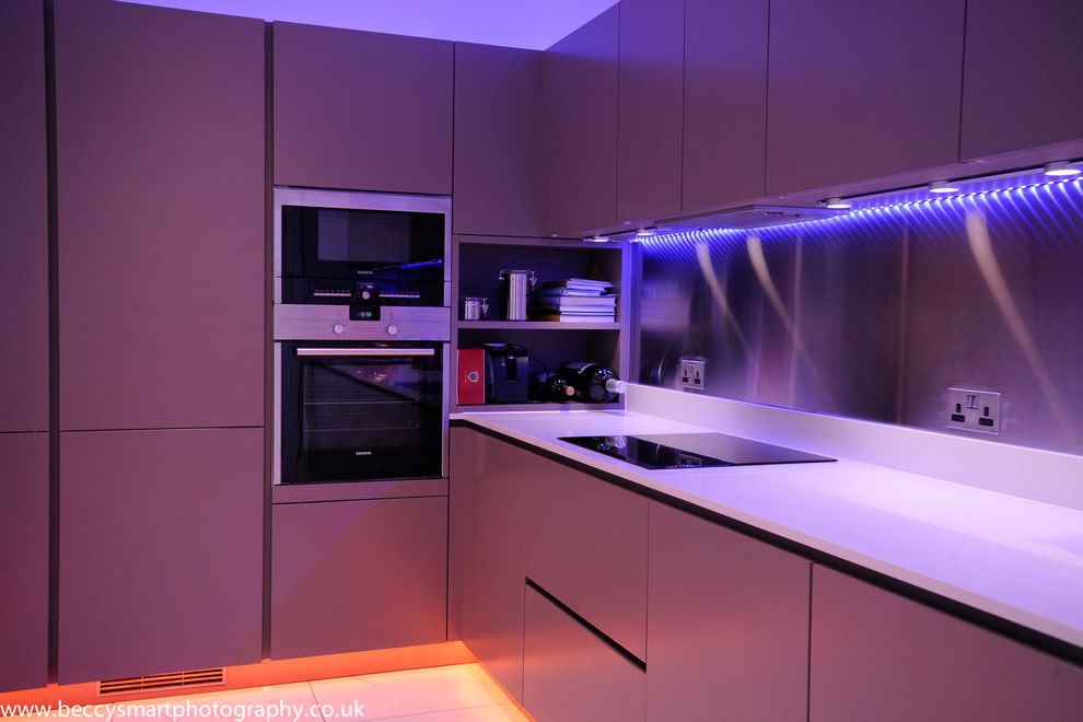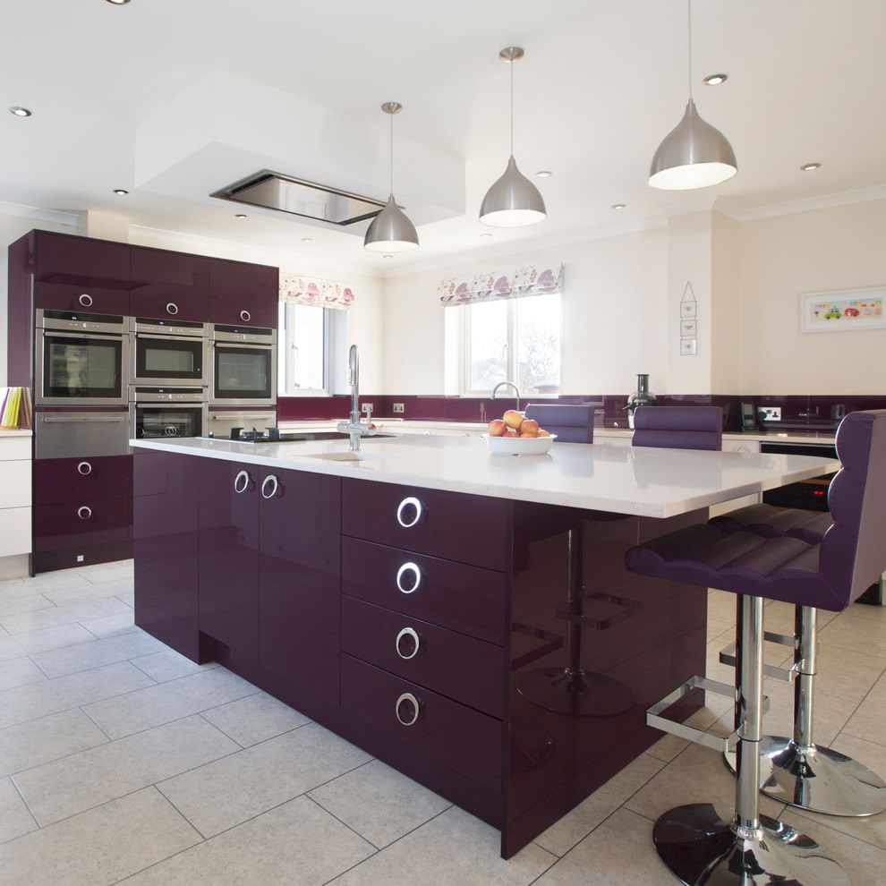 On the picture modern kitchen with white and purple photowall-paper to match the color of the facades of the kitchen set.