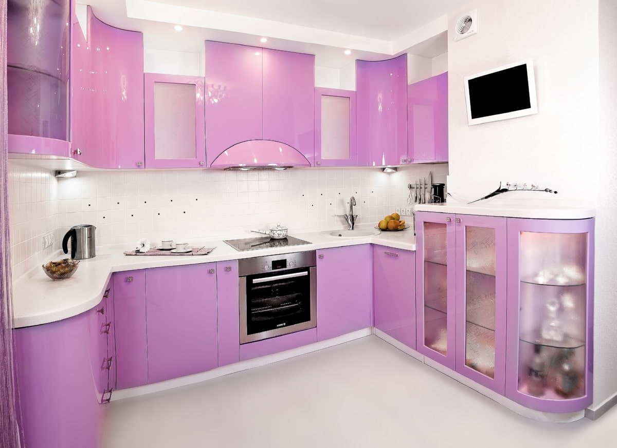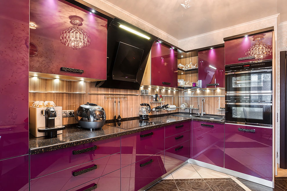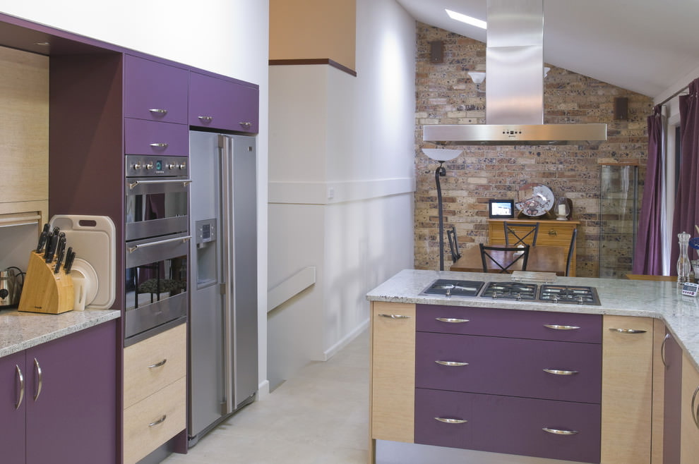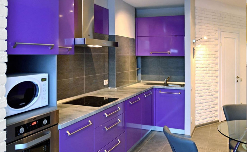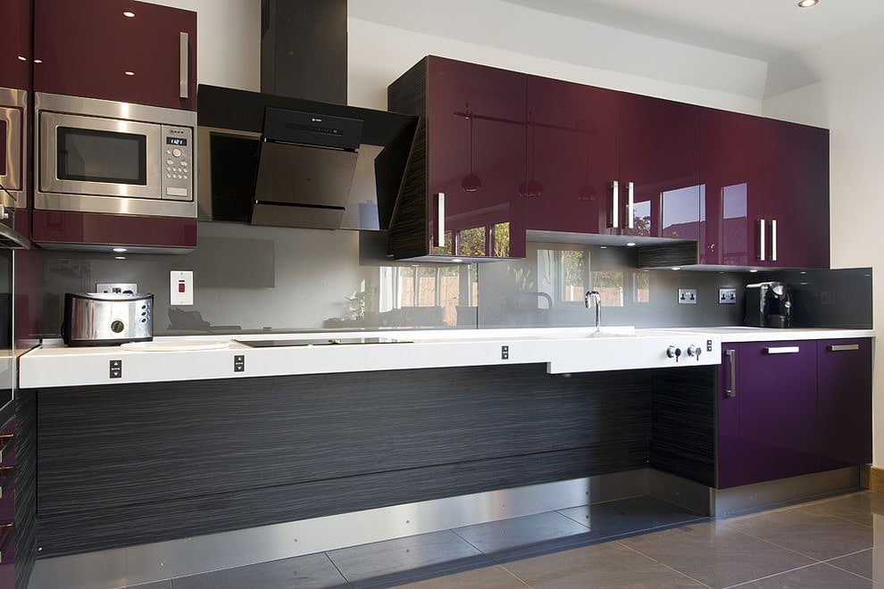 The purple headset is suitable for any style and is combined with both dark and light colors. The richness of shades allows you to create different designs of kitchen interiors in combination with decor and finishes. Below are photo examples of the use of a headset in purple tones in the interior of the kitchen.