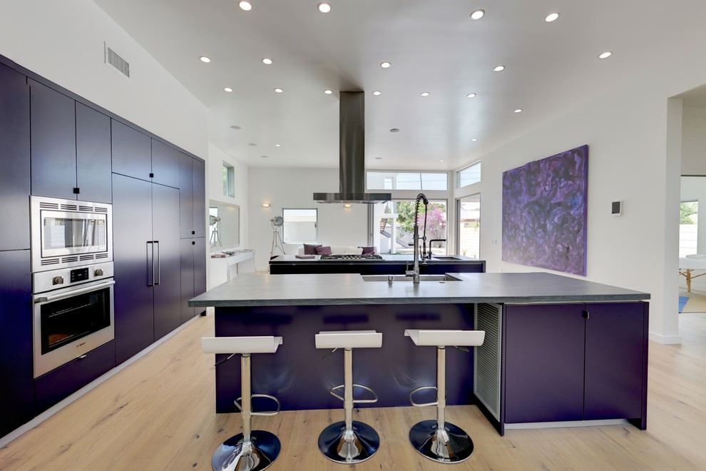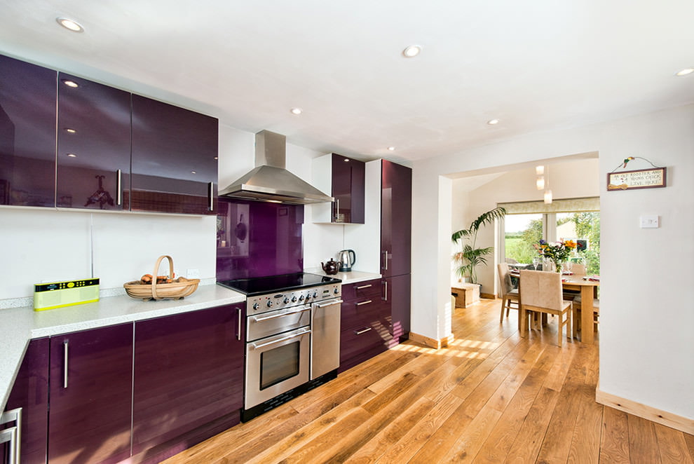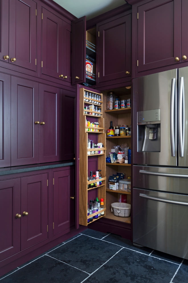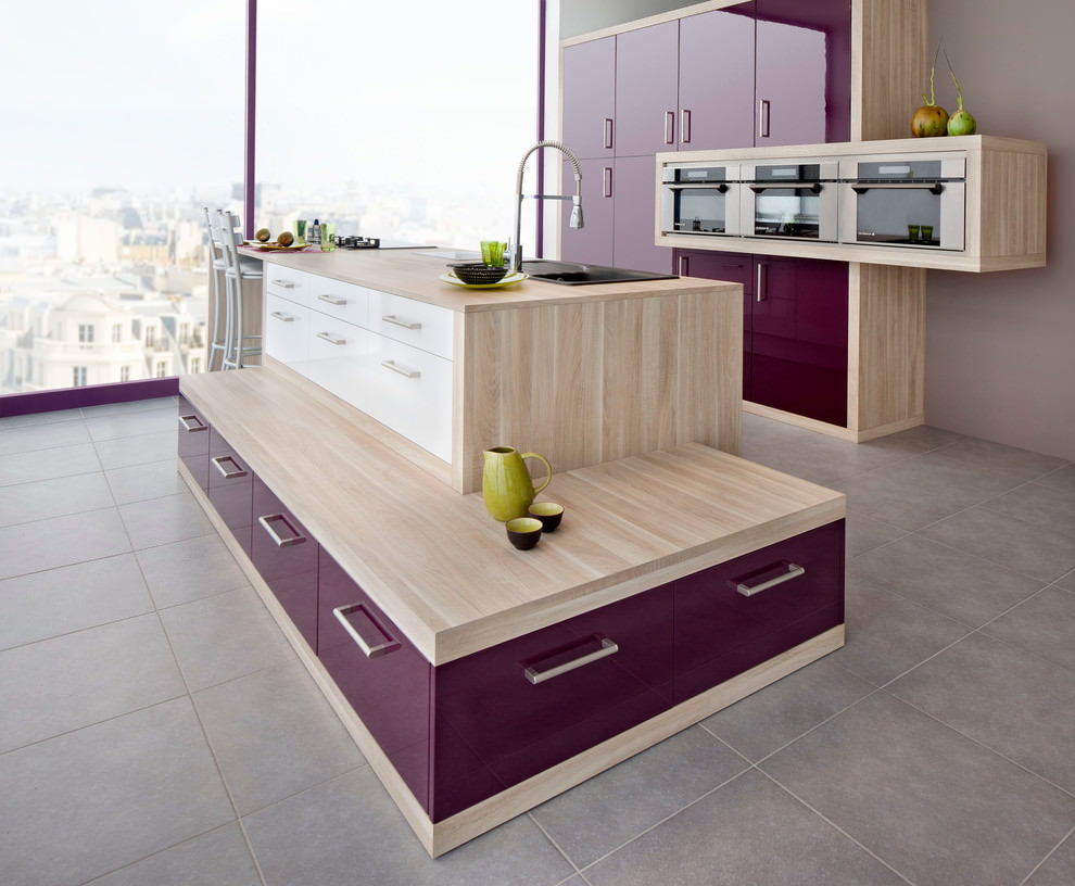 The purple headset is suitable for any style and is combined with both dark and light colors. The richness of shades allows you to create different designs of kitchen interiors in combination with decor and finishes. Below are photo examples of the use of a headset in purple tones in the interior of the kitchen.