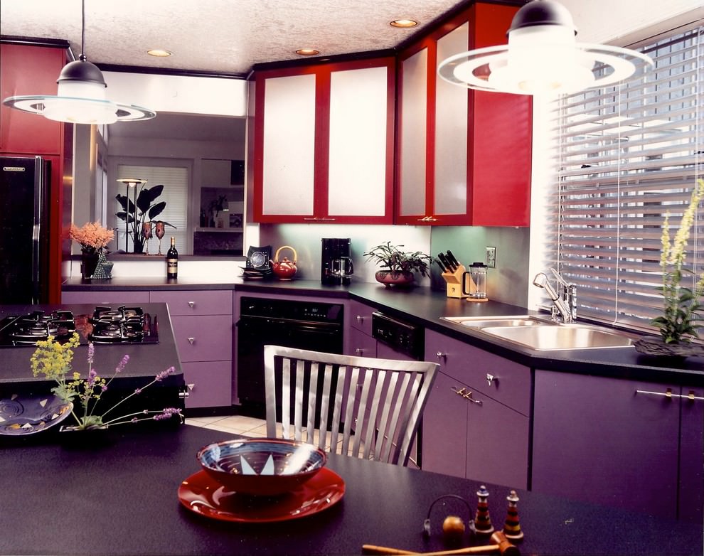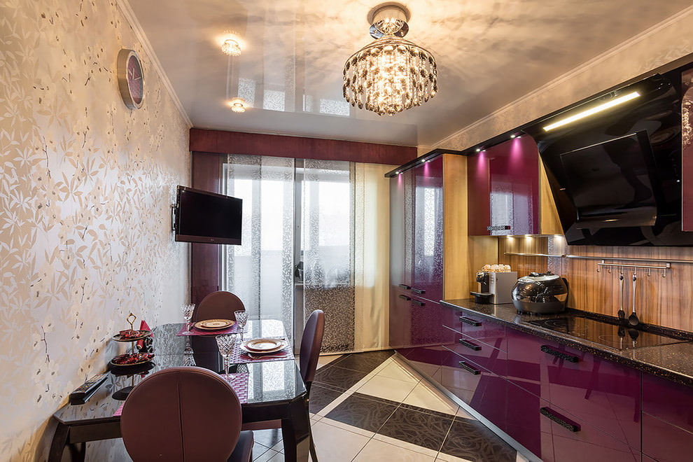 Suitable for a large kitchen and a bold interior that will always look elegant and chic. In combination with light lilac, black will become an accent. For such a duo, it is better to choose a light wallpaper.