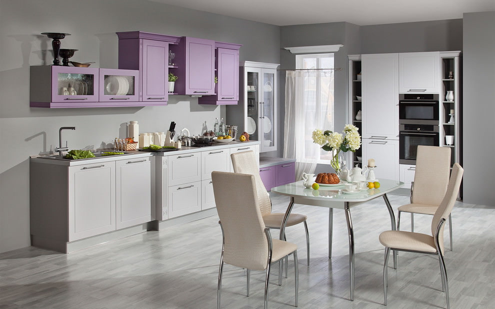 It is organically combined, it is often found and is suitable for any kitchen size. The color of the walls can be gray, white, purple in a different shade.