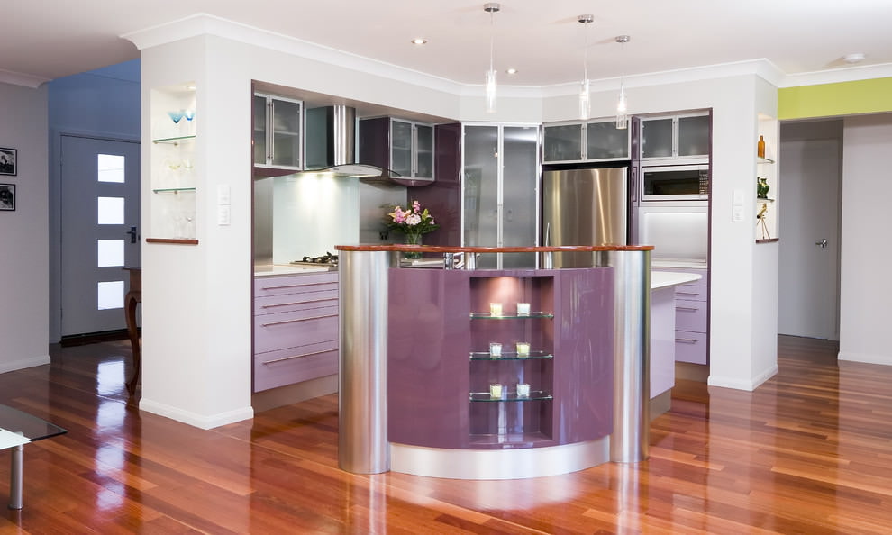 Suitable for creating a shimmering effect and color overflow due to two or three-layer paint with an aluminum powder composition, which is applied to MDF. Particularly suitable for corner kitchens with curved fronts that show the metallic overflow against a purple background.