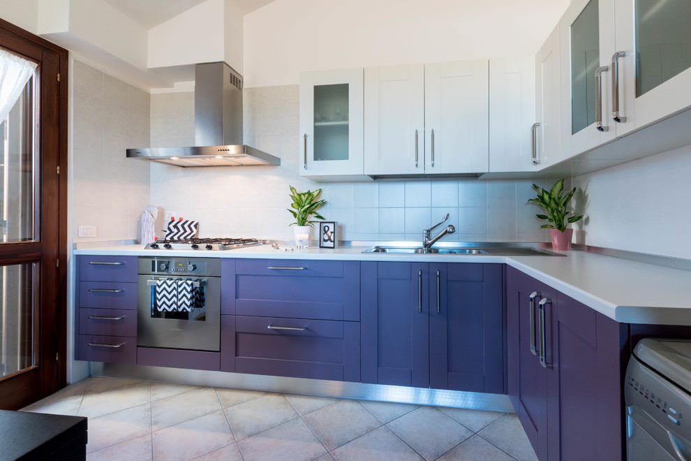 Apron it is better not to choose purple in order not to oversaturate the room. White, beige tiles, mosaics, tempered glass with a photo print, stone, brick will do, depending on the style of the kitchen. Black, white, yellow, orange, red in pastel or bright shades will do. The combination of the color of the apron with decor items, such as a flower pot, paintings, dishes, looks good.