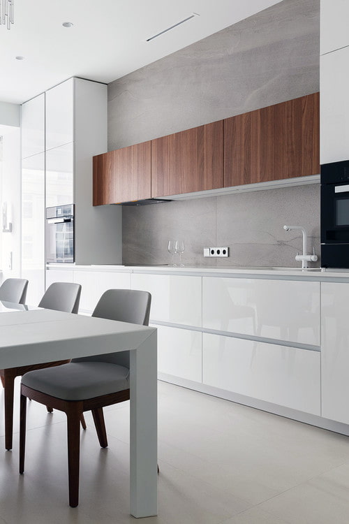 It is not necessary to use the same facades in the entire kitchen interior. The combination will make the headset more interesting and add charm to it. What are glossy doors combined with: