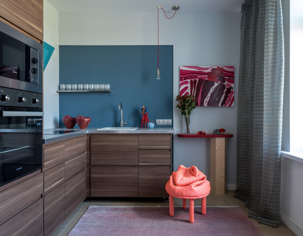 It is known that natural materials look more expensive than artificial materials, but this does not require finishing the entire kitchen in marble. The main thing is to avoid cheap imitation, the disadvantages of which are visible to the naked eye. These materials include vinyl film, linoleum with an unnatural yellow tint "wood-like", wallpaper with a banal pattern. A kitchen painted with high-quality monochromatic paint looks more expensive than wallpaper.