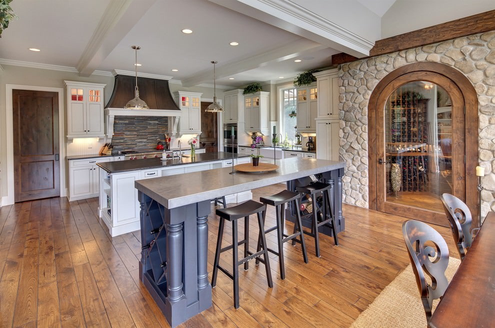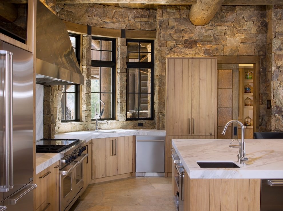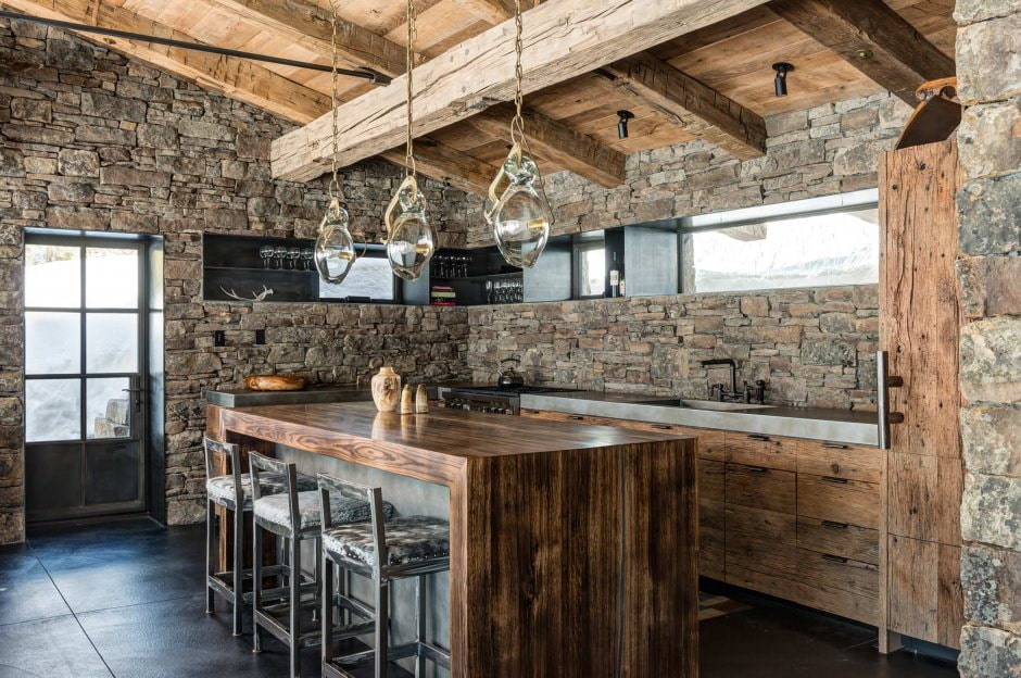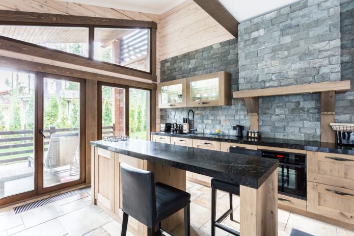 The chalet features a combination of rough, wild boulder, pebbles and a bulky wood ceiling in dark brown and gray. This style can only be created in a spacious kitchen with large windows.