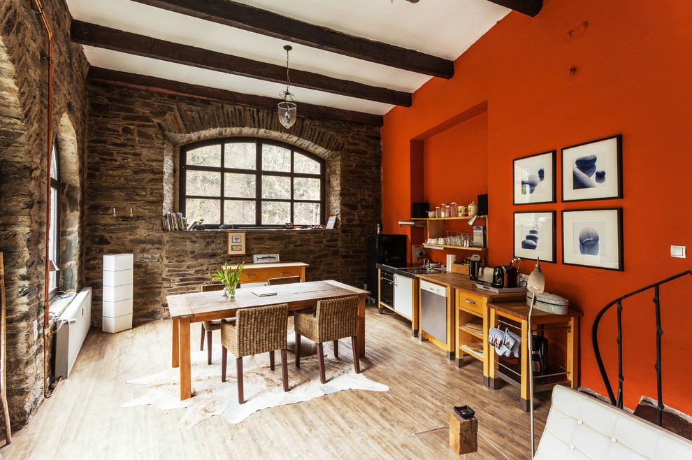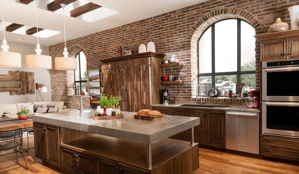 The loft is created in the kitchen using gray, red stone on the backsplash or on one of the walls, which is bordered by white, gray, black painted surfaces. Fittings and kitchen appliances must match the interior.
