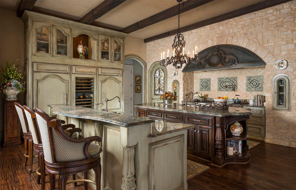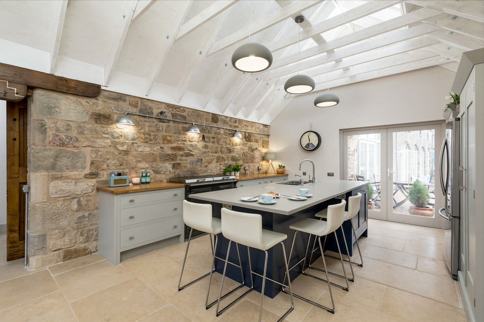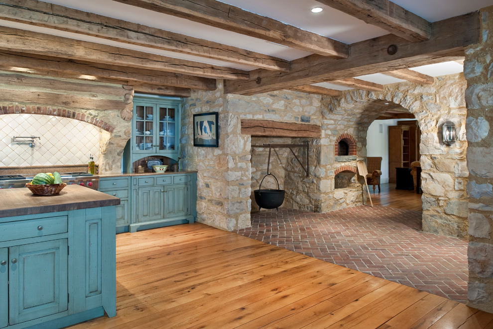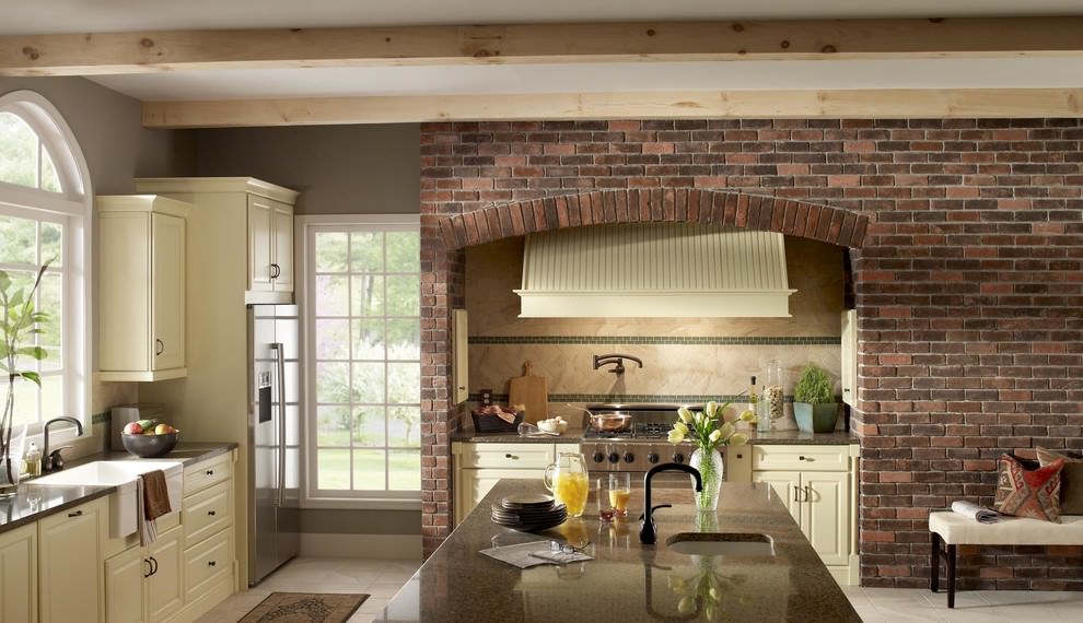 You can combine brick or stone on the wall with other finishes to create a varied kitchen interior.