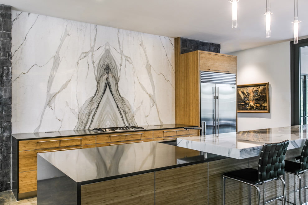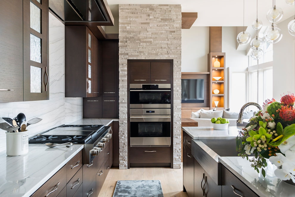 White (quartzite, granite, marble, brick) is suitable for a Scandinavian, modern classic kitchen style, expands the space and is combined with black, dark brown floors and wood paneling.