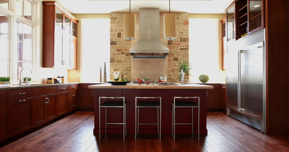 Red (brick, onyx, granite) attracts attention, is suitable for creating luxury, combined with a red countertop, dark wood.
