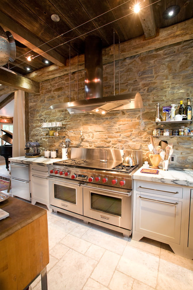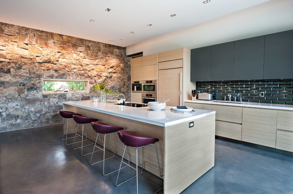 A stone wall in the kitchen has a number of advantages, including durability and strength, there is no need to make cosmetic repairs often. In addition, it is an environmentally friendly and easy-to-wall material that requires a minimum of maintenance, presented in a wide range of designs and types.