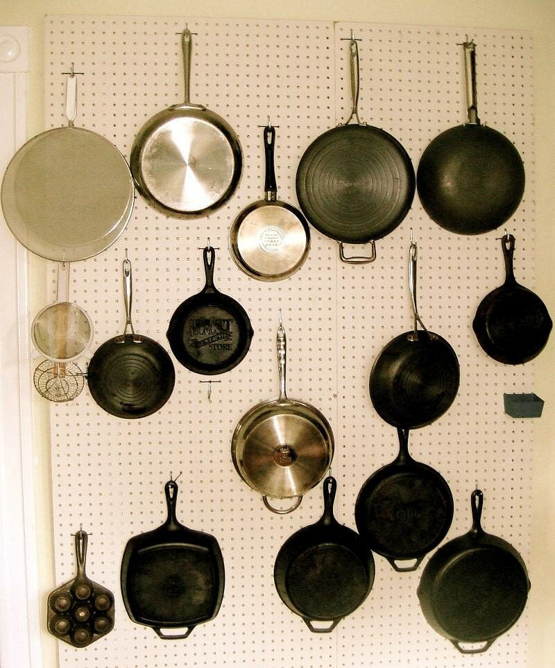 If there is a catastrophic lack of space in the kitchen, but there is a desire to make the storage area as effective as possible, hang a perforated board with removable hooks.