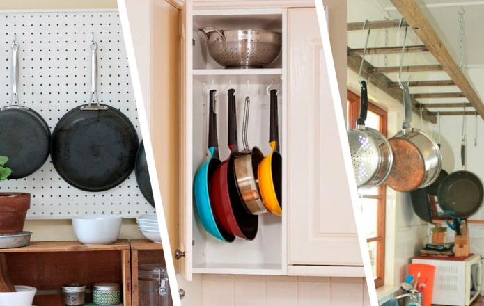 This is one of the easiest and cheapest ways to arrange your pans. conveniently: Hanging hooks are inexpensive and easy to install. You can screw them to the bottom of the shelf or hang them on a bar. Ideal for those who want to hide kitchen utensils behind closed fronts.