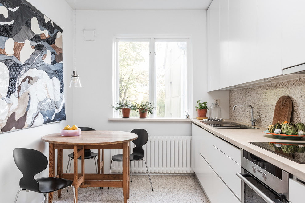 In the photo there is a round white table in the interior of a small modern kitchen.