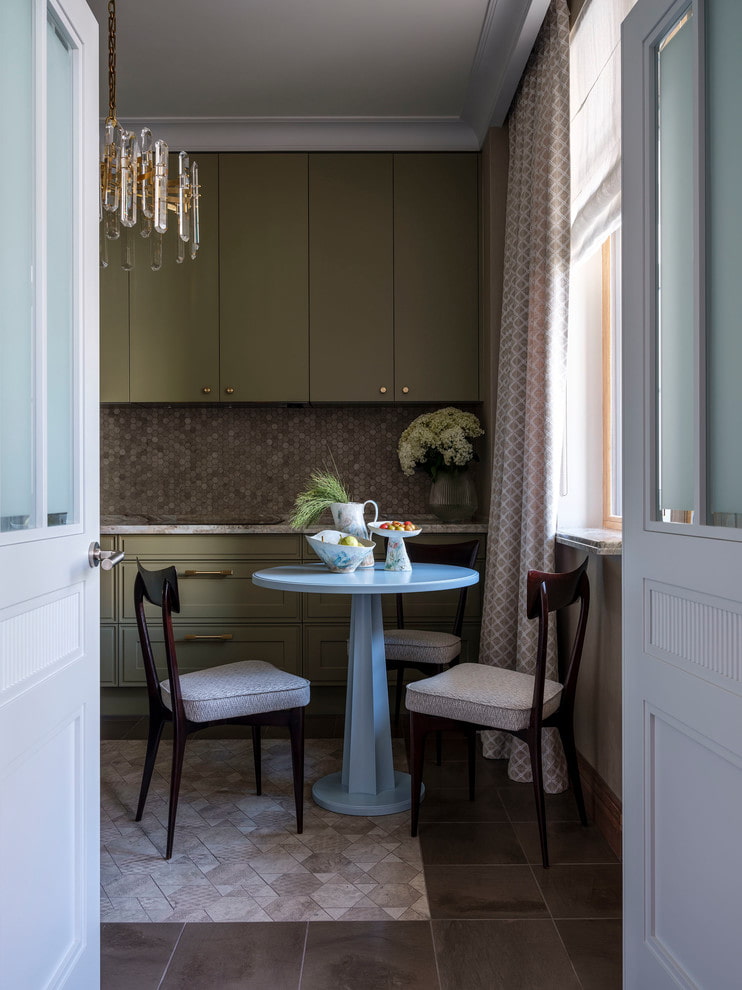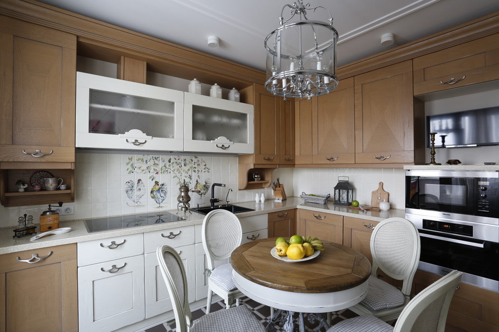 In the photo there is a classic-style kitchen with a round wooden table in a milky shade.