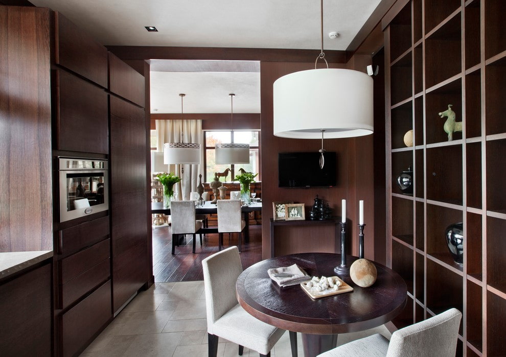 If the kitchen-living room has a rectangular and slightly elongated shape, then it is better to place this structure near a window or balcony, in a spacious room with square geometry, a round table will look very impressive in the middle. Also, quite often in this interior, a bar model with shelves or drawers is used in combination with high stools or chairs, such a design will visually zone the space.