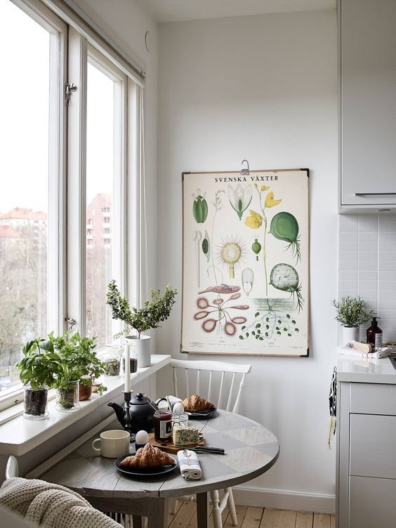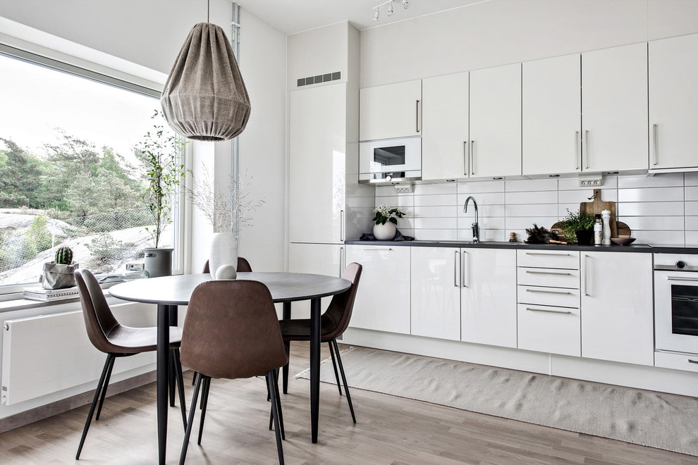 In the photo there is a round classic table in the interior of the kitchen, made in the Scandinavian style.